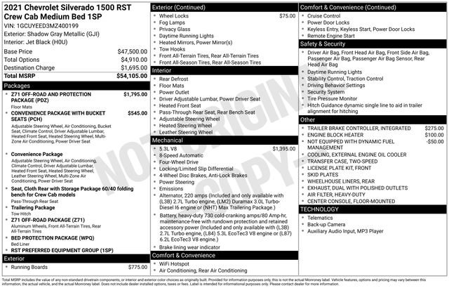 Recent Arrival! 2021 Chevrolet Silverado 1500 RST 4WD 8-Speed Automatic EcoTec3 5.3L V8 Shadow Gray Metallic 10-Way Power Driver Seat w/Lumbar, 12-Volt Rear Auxiliary Power Outlet, 2 USB Ports (First Row), 4.2 Diagonal Color Display Driver Info Center, 4G LTE Wi-Fi Hot Spot Capable, 6-Speaker Audio System, All-Star Edition, All-Weather Floor Liner (LPO) (AAK), Auto-Locking Rear Differential, Bed Protection Package, Bluetooth® For Phone, Body Color Grille, Chevrolet Connected Access Capable, Chevytec Spray-On Black Bedliner, Cloth Rear Seat w/Storage Package, Color-Keyed Carpeting Floor Covering, Compass, Convenience Package, Convenience Package w/Buckets Seats, Deep-Tinted Glass, Dual Exhaust w/Polished Outlets, Dual-Zone Automatic Climate Control, Electric Rear-Window Defogger, Electrical Lock Control Steering Column, Electronic Cruise Control, EZ Lift Power Lock & Release Tailgate, Floor Mounted Center Console, Front Bucket Seats, Front Frame-Mounted Black Recovery Hooks, Front LED Fog Lamps, Front Rubberized Vinyl Floor Mats, Heated Driver & Front Outboard Passenger Seats, Heated Steering Wheel, Heavy-Duty Air Filter, High Gloss Black Mirror Caps, Hill Descent Control, Hitch Guidance, Keyless Open & Start, Leather Wrapped Steering Wheel, LED Cargo Area Lighting, Manual Tilt/Telescoping Steering Column, Off-Road Suspension, OnStar & Chevrolet Connected Services Capable, Power Door Locks, Power Front Windows w/Driver Express Up/Down, Power Front Windows w/Passenger Express Down, Power Rear Windows w/Express Down, Preferred Equipment Group 1SP, Rear 60/40 Folding Bench Seat (Folds Up), Rear Dual USB Charging-Only Ports, Rear Rubberized-Vinyl Floor Mats, Rear Vision Camera, Rear Wheelhouse Liners, Remote Vehicle Starter System, SiriusXM Radio, Standard Tailgate, Steering Wheel Audio Controls, Theft Deterrent System (Unauthorized Entry), Trailering Package, Z71 Off-Road & Protection Package, Z71 Off-Road Package.