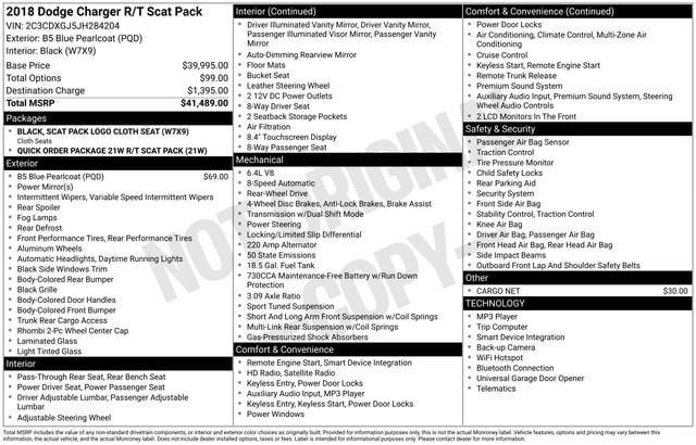 Recent Arrival! 2018 Dodge Charger R/T Scat Pack RWD 8-Speed Automatic SRT HEMI 6.4L V8 MDS B5 Blue Pearlcoat 6 Speakers, 8.4 Touchscreen Display, Air Conditioning, AM/FM radio: SiriusXM, Apple CarPlay/Android Auto, Auto-dimming Rear-View mirror, Automatic temperature control, Bumpers: body-color, Compass, Delay-off headlights, Driver door bin, Driver vanity mirror, Front dual zone A/C, Front fog lights, Front reading lights, Fully automatic headlights, Garage door transmitter: HomeLink, GPS Antenna Input, Illuminated entry, Panic alarm, Power door mirrors, Quick Order Package 21W R/T Scat Pack, Radio data system, Radio: Uconnect 4C w/8.4 Display, Rear window defroster, Security system, SiriusXM Satellite Radio, Speed control, Spoiler. Odometer is 15058 miles below market average!