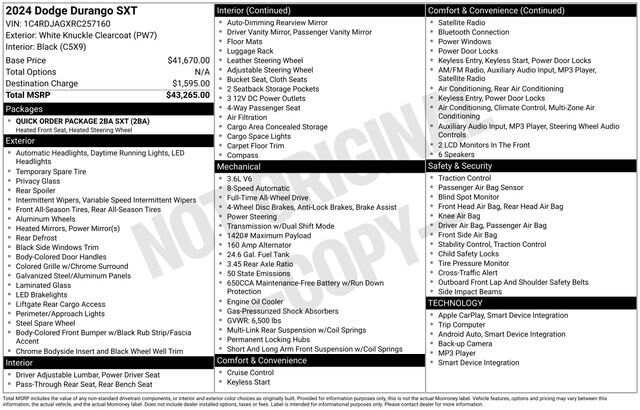 The 2024 Dodge Durango SXT is a versatile and capable SUV that offers a remarkable blend of performance, technology, and comfort. With its sleek white exterior and powerful 3.6L V6 engine, this Durango is ready to take on any adventure you have in mind.