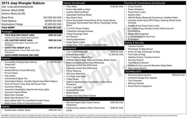 Recent Arrival! 2019 Jeep Wrangler Rubicon 4WD 8-Speed Automatic 2.0L I4 DOHC Black Clearcoat 4.10 Rear Axle Ratio, 8 Speakers, Air Conditioning, Alpine Premium Audio System, AM/FM radio: SiriusXM, Apple CarPlay/Android Auto, Automatic temperature control, Blind Spot & Cross Path Detection, Cold Weather Group, Compass, Daytime Running Lamps LED Accents, Driver door bin, Driver vanity mirror, Front Bucket Seats, Front dual zone A/C, Front LED Fog Lamps, Front reading lights, Garage door transmitter, Heated Front Seats, Heated Steering Wheel, Illuminated entry, Leather steering wheel, LED Lighting Group, LED Reflector Headlamps, LED Taillamps, MOPAR All-Weather Floor Mats, Outside temperature display, ParkSense Rear Park Assist System, Passenger vanity mirror, Power steering, Power windows, Premium Cloth Low-Back Bucket Seats, Quick Order Package 28R, Radio data system, Radio: Uconnect 4 w/7 Display, Rear reading lights, Rear Window Defroster, Rear Window Wiper/Washer, Remote keyless entry, Safety Group, Steering wheel mounted audio controls, Tachometer, Telescoping steering wheel, Tilt steering wheel, Trip computer, Variably intermittent wipers, Voltmeter, Wheels: 17 x 7.5 Machined w/Black Pockets. Odometer is 1775 miles below market average!