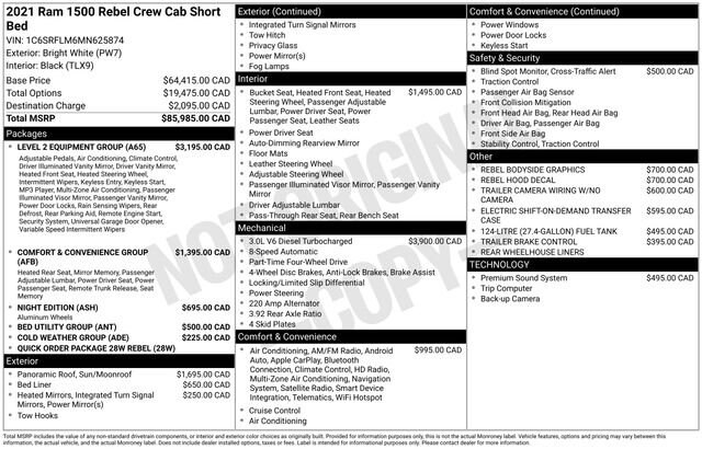 Recent Arrival! 2021 Ram 1500 Rebel 4WD 8-Speed Automatic EcoDiesel 3.0L V6 Bright White Clearcoat 115V Auxiliary Rear Power Outlet, 6 Speakers, 9 Amplified Speakers w/Subwoofer, Air Conditioning ATC w/Dual Zone Control, AM/FM radio: SiriusXM, Auto-Dimming Exterior Driver Mirror, Bed Utility Group, Black Front Bumper w/Black Plate, Black Premium Power Mirrors, Body Color Door Handles, Cold Weather Group, Comfort/Convenience Group, Driver Seat Memory, Engine Block Heater, Exterior Mirrors Courtesy Lamps, Exterior Mirrors w/Memory, Exterior Mirrors w/Supplemental Signals, Foam Bottle Insert (Door Trim Panel), GPS Antenna Input, Grille Moustache Black Outline Texture 3, Heated Front Seats, Heated Second Row Seats, Heated Steering Wheel, Media Hub w/2 Charge Only USBs, MOPAR 4 Adjustable Cargo Tie-Down Hooks, MOPAR Deployable Bed Step, MOPAR Winter Front Grille Cover, Night Edition, ParkSense Front/Rear Park Assist w/Stop, Pick-Up Box Lighting, Power 4-Way Driver Lumbar Adjust, Power 4-Way Passenger Lumbar Adjust, Power 8-Way Driver & Passenger Seats, Power Adjustable Pedals, Power-Folding Mirrors, Quick Order Package 28W Rebel, Radio data system, Radio: Uconnect 3 w/5 Display, Radio: Uconnect 4 w/8.4 Display, Rain Sensitive Windshield Wipers, RAM Grille Badge - Black, Rear Dome w/On/Off Switch Lamp, Rear Underseat Compartment Storage, Rear Window Defroster, Rebel Level 2 Equipment Group, Remote Proximity Keyless Entry, Remote Tailgate Release, Security Alarm, SiriusXM Radio Service, SiriusXM Satellite Radio, Sun Visors w/Illuminated Vanity Mirrors, Universal Garage Door Opener, Wheels: 18 x 8.0 Gloss Black, Wireless Charging Pad. 21/29 City/Highway MPG Odometer is 21903 miles below market average! Priced below KBB Fair Purchase Price!