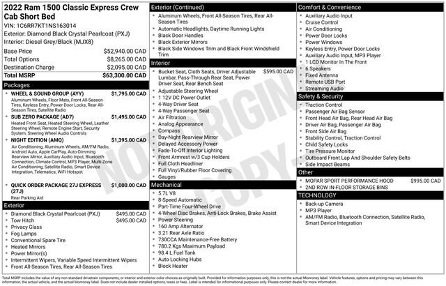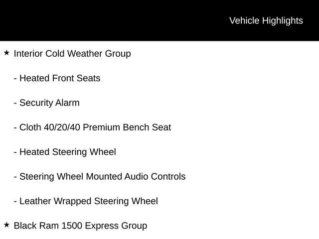 Recent Arrival! 2022 Ram 1500 Classic Express 4WD 8-Speed Automatic HEMI 5.7L V8 Multi Displacement VVT Diamond Black Crystal Pearlcoat 1 Year Trial (Registration Required), 115V Auxiliary Power Outlet, 17 x 7 Aluminum Wheels, 2nd Row In Floor Storage Bins, 40/20/40 Split Bench Seat, 4G LTE Wi-Fi Hot Spot, 4x4 Flat Black Badge, 6 Speakers, 8.4 Touchscreen Display, Active Grille Shutters, Air Conditioning, Air Conditioning ATC w/Dual Zone Control, AM/FM radio, Apple CarPlay, Audio Input Jack for Mobile Devices, Auto-Dimming Rear-View Mirror, Black Exterior Truck Badging, Black Headlamp Bezels, Black Painted Honeycomb Grille, Black Ram 1500 Express Group, Black RAM Tailgate Nameplate, Body Color Front Fascia, Body Color Grille, Body Color Rear Bumper w/Step Pads, Carpet Floor Covering, Center Hub, Cloth 40/20/40 Premium Bench Seat, Cluster 7.0 TFT Color Display, Compass, Driver door bin, Electronic Shift, Engine Calibration Flash, V2, Express Value Package, Folding Flat Load Floor Storage, For Details Visit DriveUconnect.com, For More Info, Call 800-643-2112, Front Armrest w/3 Cupholders, Front Center Armrest, Front Center Seat Cushion Storage, Front Floor Mats, Front Fog Lamps, Global Telematics Box Module (TBM), Google Android Auto, GPS Antenna Input, Heated door mirrors, Heated Front Seats, Heated Steering Wheel, Heavy Duty Vinyl 40/20/40 Split Bench Seat, Humidity Sensor, Integrated Center Stack Radio, Integrated Voice Command w/Bluetooth, Interior Cold Weather Group, Leather Wrapped Steering Wheel, Manual Adjust Seats, Media Hub (2 USB, AUX), No Satellite Coverage w/HI/AK/PR/VI/GU, Outside temperature display, Overhead console, Power 10-Way Driver Seat, Power door mirrors, Power Lumbar Adjust, Power steering, Power windows, Quick Order Package 27J Express, Radio: Uconnect 5 W w/8.4 Display, Ram 1500 Express, Rear 60/40 Split Folding Seat, Rear Floor Mats, Rear Folding Seat, Rear step bumper, Remote Keyless Entry w/All-Secure, Remote USB Port, Remote USB Port - Charge Only, Rotary Shifter-Black, Security Alarm, Semi-Gloss Black Hub, SiriusXM Guardian - Included Trial (B), SiriusXM Radio Service, SiriusXM Satellite Radio, Speed control, Steering Wheel Mounted Audio Controls, Storage Tray, Tachometer, Tilt steering wheel, Tip Start, Traction control, USB Host Flip, Voltmeter, Wheels: 20 x 8 High Gloss Black Aluminum.